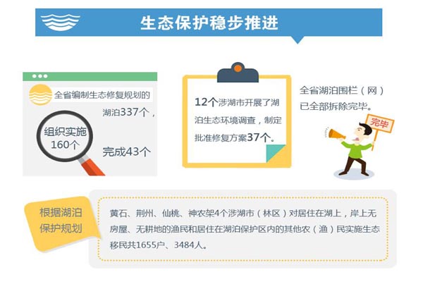 全省编制生态修复规划的湖泊337个,组织实施160个,完成43个;12个涉湖市开展了湖泊生态环境调查,制定批准修复方案37个;全省湖泊围栏(网)已全部拆除完毕,共拆除围栏(网)929处,437668亩。根据湖泊保护规划,黄石、荆州、仙桃、神农架4个涉湖市(林区)对居住在湖上,岸上无房屋、无耕地的渔民和居住在湖泊保护区内的其他农(渔)民实施生态移民共1655户、3484人。