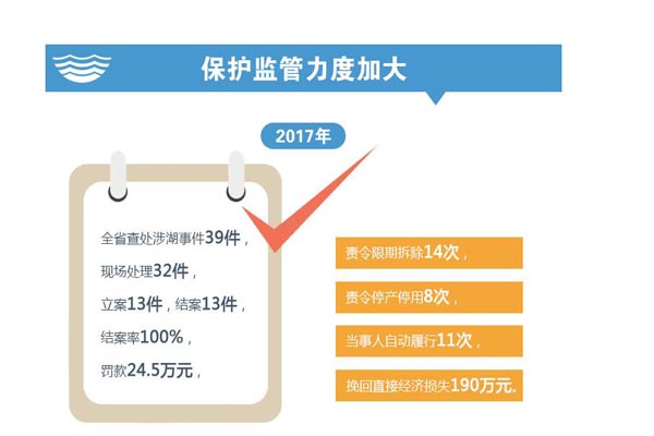 2017年,全省查处涉湖事件39件,现场处理32件,立案13件,结案13件,结案率100%,罚款24.5万元,责令限期拆除14次,责令停产停用8次,当事人自动履行11次,挽回直接经济损失190万元。2017年,各市人民政府与下级人民政府签订湖泊保护责任书119份、开展责任书考核92个。县级及以上地方人民政府协调解决湖泊保护工作中的重大问题119个;市人民政府对保护湖泊不力的县(市、区)人民政府主要负责人实行约谈7次。