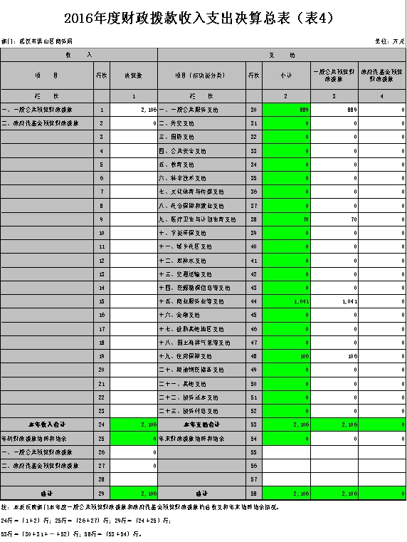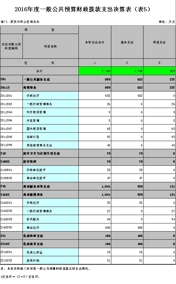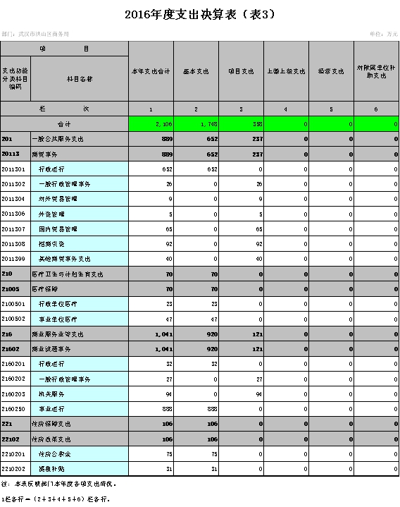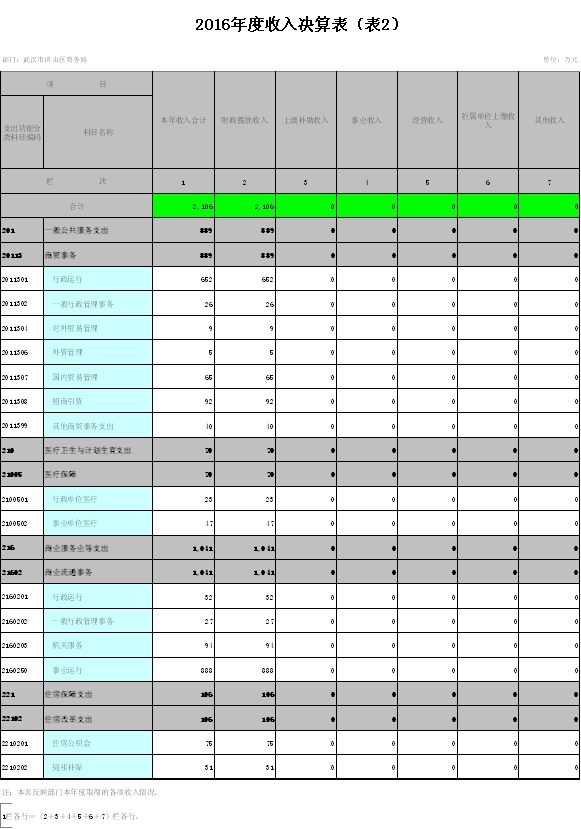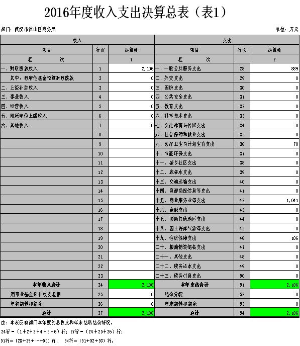 2016年度收入总计2,106万元,支出总计2,106万元。与2015年相比,收入增加190万元,增长9.92%,主要原因是财政拨款收入增加。支出增加190万元,增长9.92%,主要原因是商业服务业等支出增加。