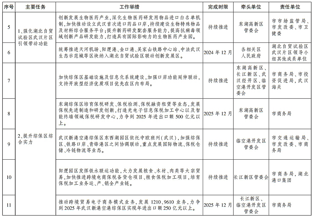 1.强化湖北自贸试验区武汉片区引领带动功能。深入实施自贸区提升战略,围绕产业发展需求深化制度创新,加快高端高质高新产业集聚,湖北自贸试验区武汉片区每年探索形成制度创新成果20—25项,布局建设联动创新发展区。做实科创自贸,以人才、设备、知识产权、科研项目为重点,探索与国际规则接轨的创新机制,赋予国家重大科学技术设施和产业基地新活力,参照国际一流标准和通行科研组织方式,建好建强国家重大科技基础设施和国家实验室等创新平台;开展合格境外有限合伙人(QFLP)试点,推动境外投资人和资金投资科技中小企业,大力招引头部基金管理人落户。推动数字自贸建设,聚焦第五代移动通信技术/第六代移动通信技术(5G/6G)、北斗、人工智能、区块链等数字经济前沿领域,推动数字经济产业集群发展;加快建设国家先进存储产业创新中心、国家信息光电子创新中心、国家数字化设计与制造创新中心等项目;依托光电子信息生产和贸易头部企业,打造全国性电子元器件和集成电路联合采购、资源调剂和国际交易平台。创新发展生物医药产业,深化生物医药研发用物品进口白名单机制,加快推动设立武汉首次进口药品口岸,持续建设生物特殊物品及材料综合服务平台;提升新药研发配套服务能力,提高抗病毒领域创新产品研发能力,打造具有国际影响力的生物医药产业园。统筹推进天河机场、阳逻港、金口港、吴家山铁路中心站、中法武汉生态示范城等区块纳入湖北自贸试验区联动创新发展区。(责任单位:东湖高新区管委会,市经信局,湖北自贸试验区武汉片区领导小组其他成员单位)