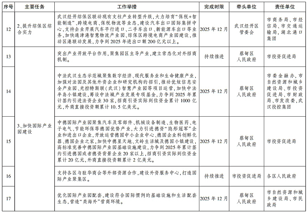 2.提升综保区综合实力。加快综保区基础设施及信息化系统建设,加强口岸功能延伸联动,支持开放型经济优质项目优先在区内布局。东湖综保区培育保税研发、保税检测、保税融资租赁等业态,发展保税先进制造和研发创新,打造光电子信息保税加工中心以及智能终端领域保税研发中心,力争到2025年进出口额500亿元以上。武汉新港空港综保区东西湖园区依托中欧班列(武汉),加强综保区、铁路口岸、青锋港区之间协调联动,重点发展国际物流、保税仓储、冷链物流等业态;阳逻园区发挥铁水联运功能,大力发展粮食、木材、肉类等大宗贸易,加快推进跨境电商保税备货仓项目、粮食保税加工项目,培育保税加工业务运、产、销全产业链。推动跨境贸易电子商务模式业务,发展1210、9610业务,力争到2025年武汉新港空港综保区实现年进出口额250亿元以上。武汉经开综保区联动现有支柱产业转型升级,大力培育“保税+智能制造”、跨境电商、保税物流等业态,建设汽车出口国际集拼中心,支持开展汽车平行进口、二手车出口、新能源车出口等业务,加快通津港智慧物流产业园、综保区跨境电商产业园建设,推动区港联动发展,力争到2025年进出口额200亿元以上。(责任单位:东湖高新区、长江新区、武汉经开区、临空港开发区管委会,市商务局、市交通运输局、市发改委、市经信局,武汉海关,湖北港口集团)