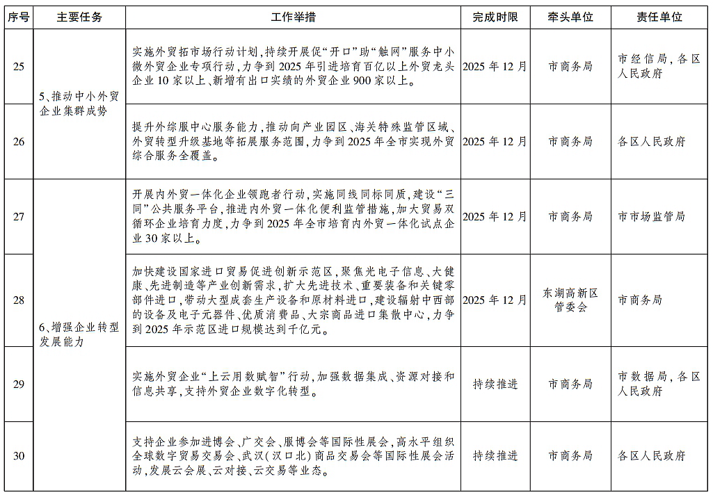 6.增强企业转型发展能力。开展内外贸一体化企业领跑者行动,实施同线同标同质,建设“三同”公共服务平台,推进内外贸一体化便利监管措施,加大贸易双循环企业培育力度,力争到2025年培育内外贸一体化试点企业30家以上。加快建设国家进口贸易促进创新示范区,聚焦光电子信息、大健康、先进制造等产业创新需求,扩大先进技术、重要装备和关键零部件进口,带动大型成套生产设备和原材料进口,建设辐射中西部的设备及电子元器件、优质消费品、大宗商品进口集散中心,力争到2025年示范区进口规模达到千亿元。实施外贸企业“上云用数赋智”行动,加强数据集成、资源对接和信息共享,支持外贸企业数字化转型。支持企业参加进博会、广交会、服博会等国际性展会,高水平组织全球数字贸易交易会、武汉(汉口北)商品交易会等国际性展会活动,发展云会展、云对接、云交易等业态。(责任单位:市商务局、市市场监管局、市数据局,各区人民政府)