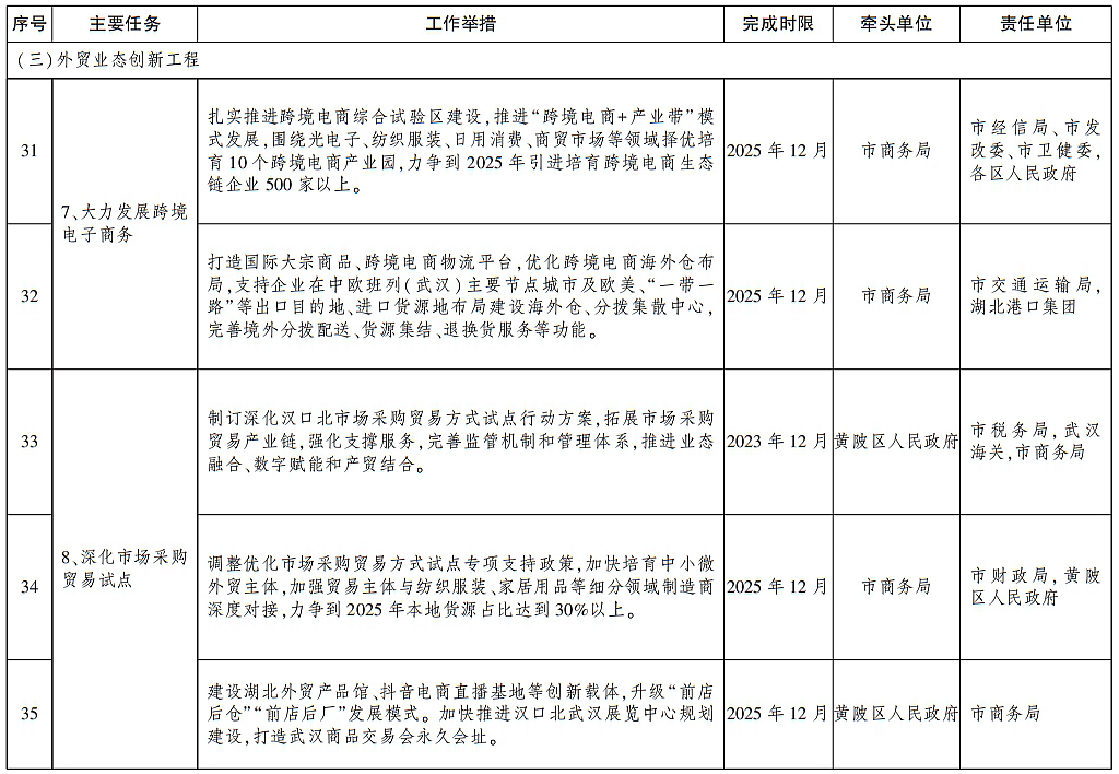 7.大力发展跨境电子商务。扎实推进跨境电商综合试验区建设,推进“跨境电商+产业带”模式发展,围绕光电子、纺织服装、日用消费、商贸市场等领域择优培育10个跨境电商产业园,力争到2025年引进培育跨境电商生态链企业500家以上。打造国际大宗商品、跨境电商物流平台,优化跨境电商海外仓布局,支持企业在中欧班列(武汉)主要节点城市及欧美、“一带一路”等出口目的地、进口货源地布局建设海外仓、分拨集散中心,完善境外分拨配送、货源集结、退换货服务等功能。(责任单位:市商务局,市跨境电商工作领导小组其他成员单位)