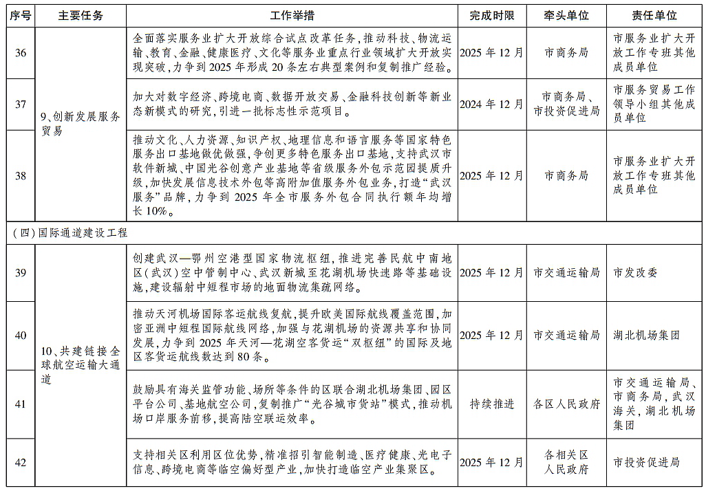 9.创新发展服务贸易。全面落实服务业扩大开放综合试点改革任务,推动科技、物流运输、教育、金融、健康医疗、文化等服务业重点行业领域扩大开放实现突破,力争到2025年形成典型案例和复制推广经验20项左右。加大数字经济、跨境电商、数据开放交易、金融科技创新等新业态新模式研究,引进一批标志性示范项目。推动文化、人力资源、知识产权、地理信息和语言服务等国家特色服务出口基地做优做强,争创更多特色服务出口基地,支持武汉市软件新城、中国光谷创意产业基地等省级服务外包示范园提质升级,加快发展信息技术外包等高附加值服务外包业务,打造“武汉服务”品牌,力争到2025年服务外包合同执行额年均增长10%。(责任单位:市商务局,市服务贸易工作领导小组其他成员单位)