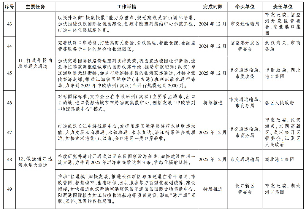 11.打造外畅内联陆运大通道。以提升双向“快集快散”能力为重点,规划建设吴家山国际陆港,加快推进汉欧国际物流园建设,创建中欧班列集结中心示范工程,打造一体化集疏运体系。完善铁路口岸功能,打造集海关查验、公铁集运、智能仓配、金融监管等服务于一体的综合性物流园区。加快完善国际铁路货运班列支持政策,巩固直达德国杜伊斯堡、波兰马拉等欧洲枢纽城市的国际铁路干线,推动中欧班列(武汉)与江海联运无缝衔接,加快布局连接东盟的铁海联运通道,对接中蒙俄经济走廊,推动江海铁国际联运(东方港)班列班轮化运行布局,力争到2025年中欧班列(武汉)年开行规模达到2000列。对标国际标准,支持企业在中欧班列(武汉)主要节点城市、出口目的地、进口货源地城市布局物流集散中心,创新发展“中欧班列+物流集散中心”模式。(责任单位:市交通运输局、市发改委、市财政局、市商务局,武汉海关,湖北港口集团,各区人民政府)
