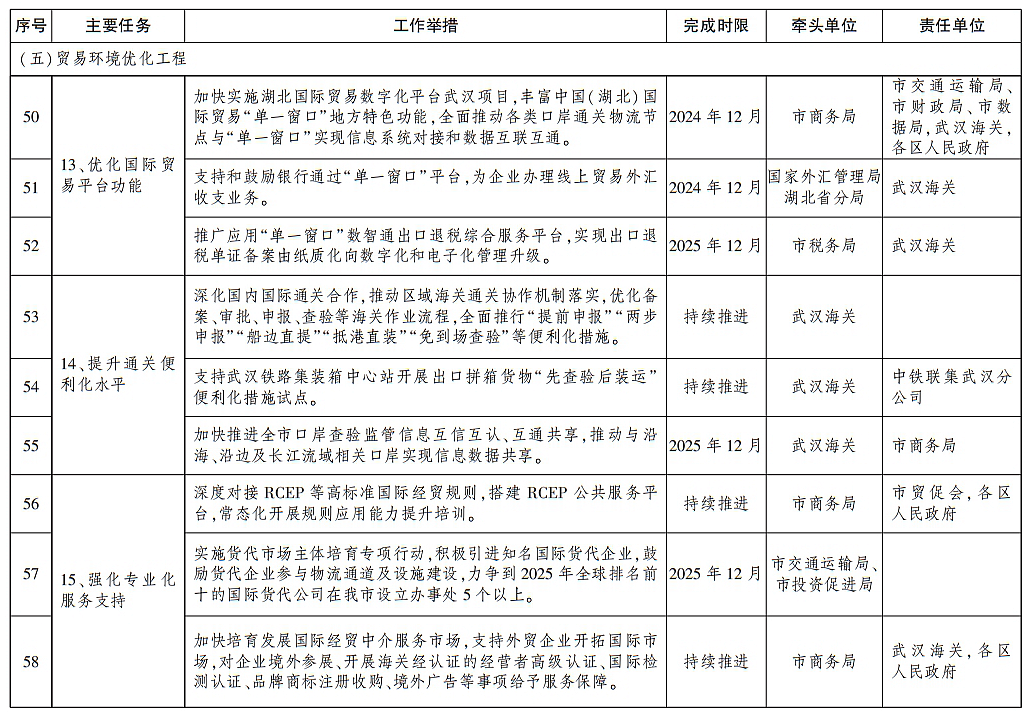 13.优化国际贸易平台功能。加快实施湖北国际贸易数字化平台武汉项目,丰富中国(湖北)国际贸易“单一窗口”地方特色功能,全面推动各类口岸通关物流节点与“单一窗口”实现信息系统对接和数据互联互通。支持和鼓励银行通过“单一窗口”平台,为企业办理线上贸易外汇收支业务。推广应用“单一窗口”数智通出口退税综合服务平台,实现出口退税单证备案由纸质化向数字化和电子化管理升级。(责任单位:市商务局、市交通运输局、市财政局、市数据局,市税务局,武汉海关,国家外汇管理局湖北省分局,各区人民政府)