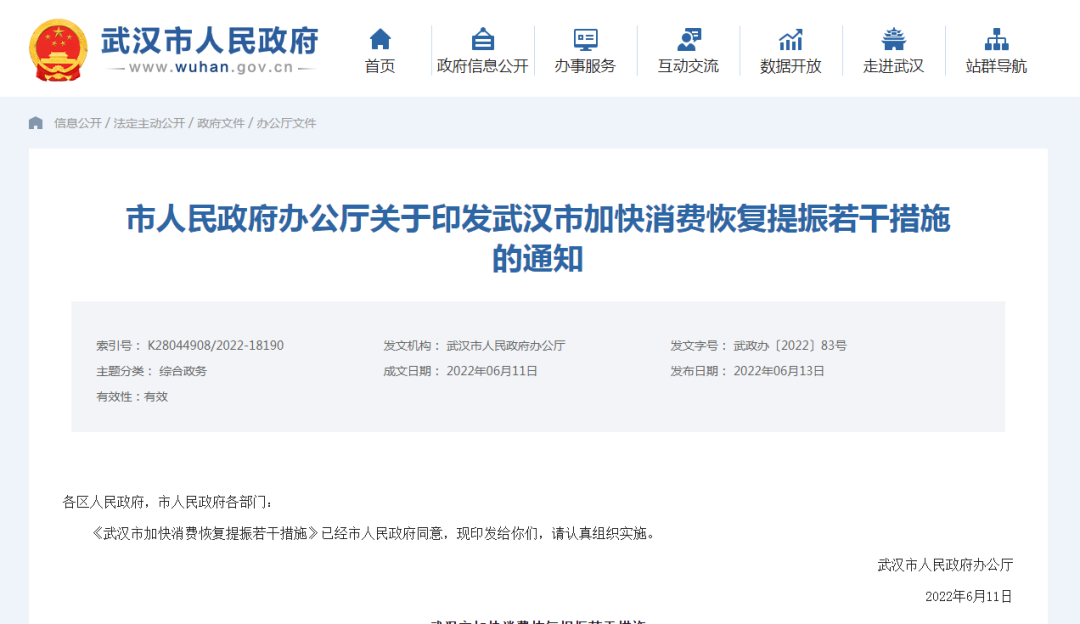 为进一步激发全市消费潜力,扩大消费需求,提振消费信心,促进消费加快恢复,6月13日,武汉市人民政府网站发布《武汉市加快消费恢复提振若干措施》(以下简称《若干措施》)。