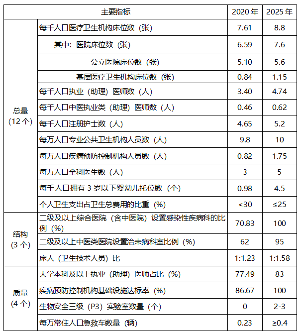 ③社区卫生服务中心(站)、乡镇卫生院、村卫生室、中小学校卫生(保健)室等基层医疗卫生机构设置原则:每个区选择2-5家社区卫生服务中心或乡镇卫生院,按照社区医院或二级医院标准建设若干区域基层医疗卫生服务中心。创新性对校医制和厂医制提出了要求。提出医防结合、医养融合、中西医协同、社会办医与多元化发展等机构的功能整合与分工协作原则。2.床位配置 床位总量、结构分布、区域分布及单体规模配置原则:到2025年,每千人口床位数不超过8.8张,增量床位优先向传染病、重症、精神、康复、护理等短缺领域倾斜。市办综合医院床位数以1000张左右为宜,原则上不超过1200张;区办综合医院床位数以800张左右为宜,原则上不超过1000张。3.人员配置