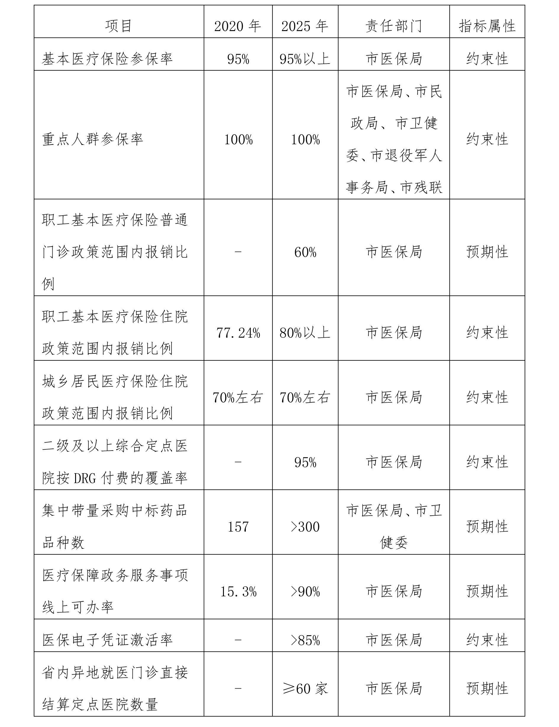 “十四五”时期,我市医疗保障事业发展的总体目标是实现多层次医疗保障制度体系的成熟定型。根据省委省政府《关于全省深化医疗保障制度改革的若干措施》,结合我市实际情况,到2022年,基本医疗保险实现应保尽保、应缴尽缴,职工基本医疗保险门诊统筹制度全面实施,跨省异地就医门诊实现直接结算,支付方式改革取得明显成效,基金监管体制机制进一步优化,医药服务价格形成机制更加完善,医疗保障协同治理体系基本形成,医疗保障公共管理服务水平明显提高。到2025年,我市医疗保障关键领域改革基本完成,基本建成公平医保、法治医保、安全医保、智慧医保、协同医保,实现医疗保障高质量发展。