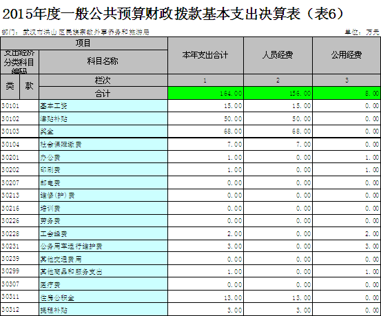 2015度一般公共预算财政拨款基本支出164万元,其中,人员经费156万元,主要包括:基本工资、津贴补贴、奖金、社会保障缴费、绩效工资、其他工资福利支出、离休费、退休费、抚恤金、退职(役)费、抚恤金、生活补助、救济费、医疗费、助学金、奖励金、生产补贴、住房公积金、提租补贴、购房补贴、其他对个人和家庭的补助支出;公用经费8万元,主要包括:办公费、印刷费、咨询费、手续费、水费、电费、邮电费、取暖费、物业管理费、差旅费、因公出国(境)费、维修(护)费、租赁费、会议费、培训费、公务接待费、专用材料费、被装购置费、专用燃料费、劳务费、委托业务费、工会经费、福利费、公务用车运行维护费、其他交通费用、税金及附加费用、其他商品和服务支出。